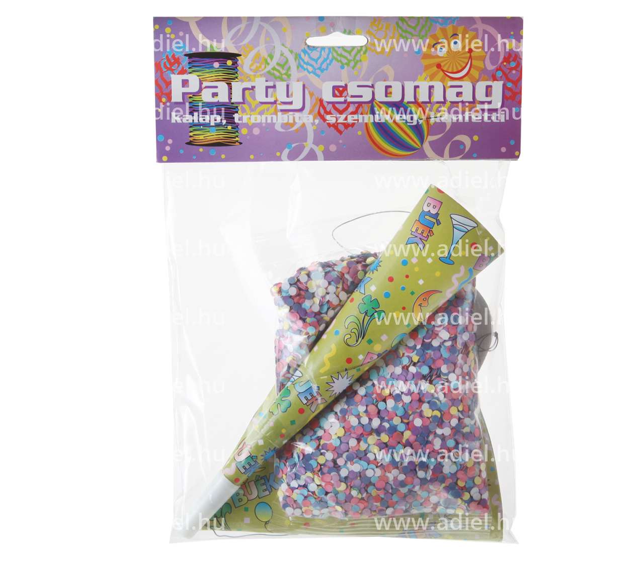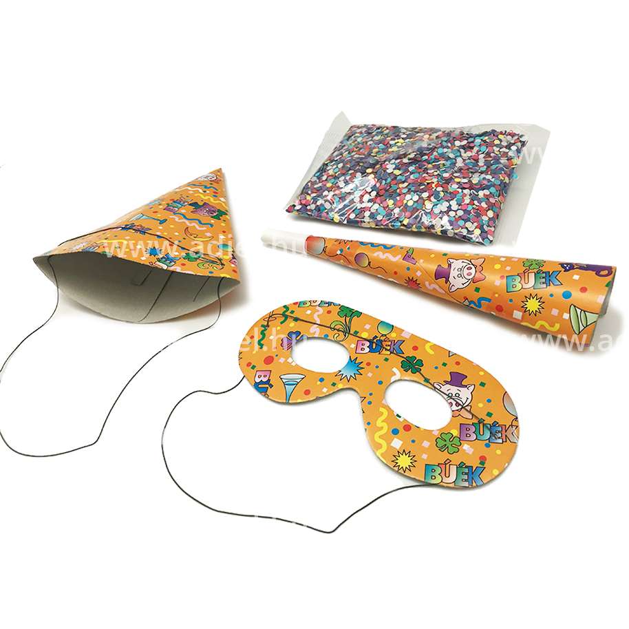 A csomag tartalma: Kalap, Szemüveg, Trombita, Konfetti